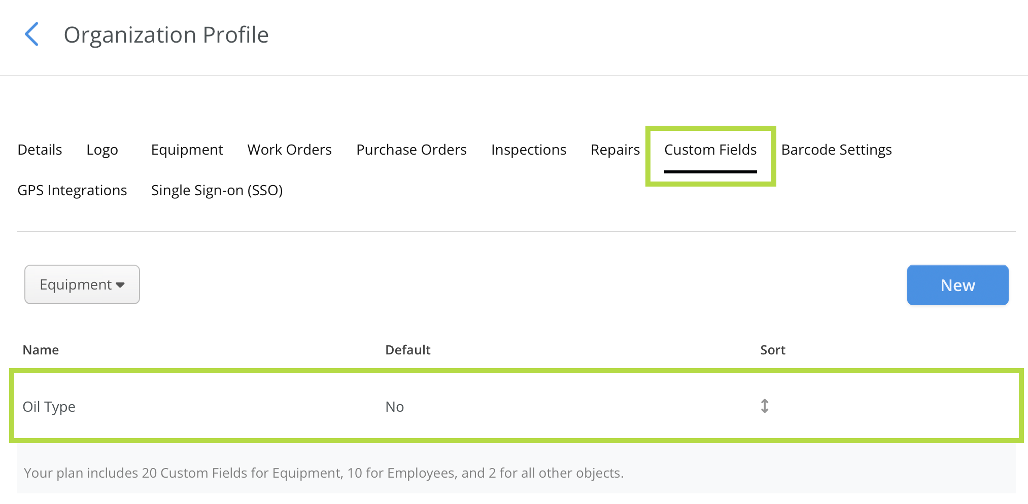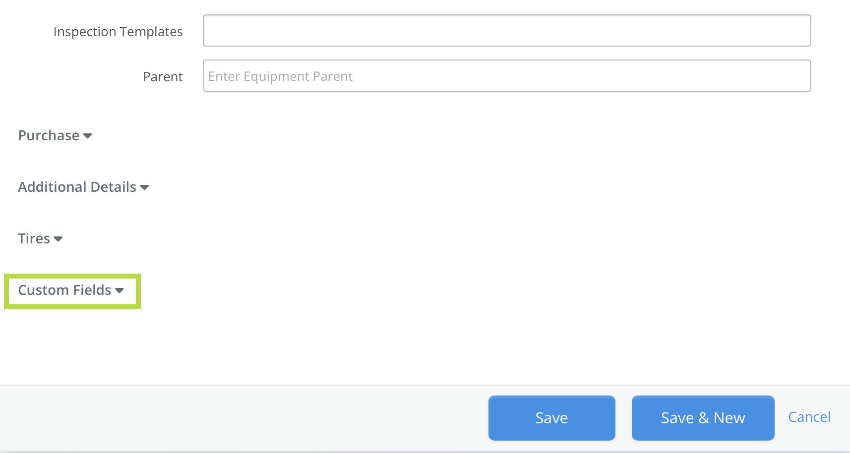 To track data beyond the default fields without using free-form notes, Custom Fields provide an ideal solution. To add one, scroll to the bottom of the New Equipment screen to create and define a new Custom Field.