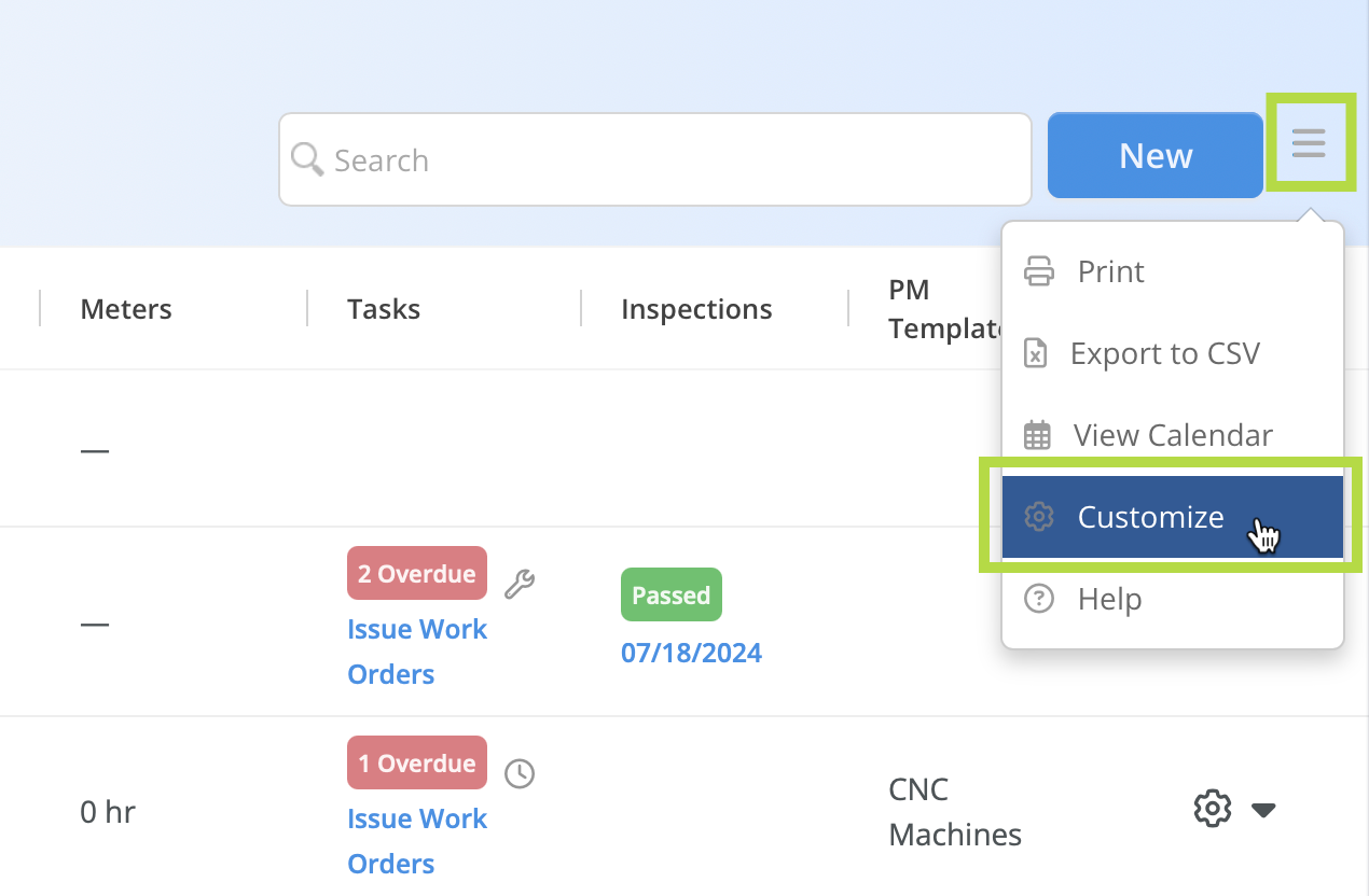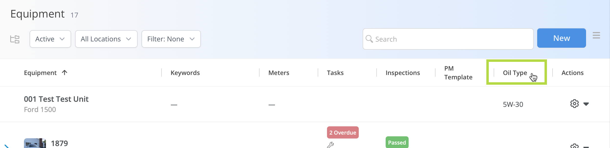 The Custom Field can be displayed as a separate column in the Equipment Index. To add, click the button right of New and select Customize.