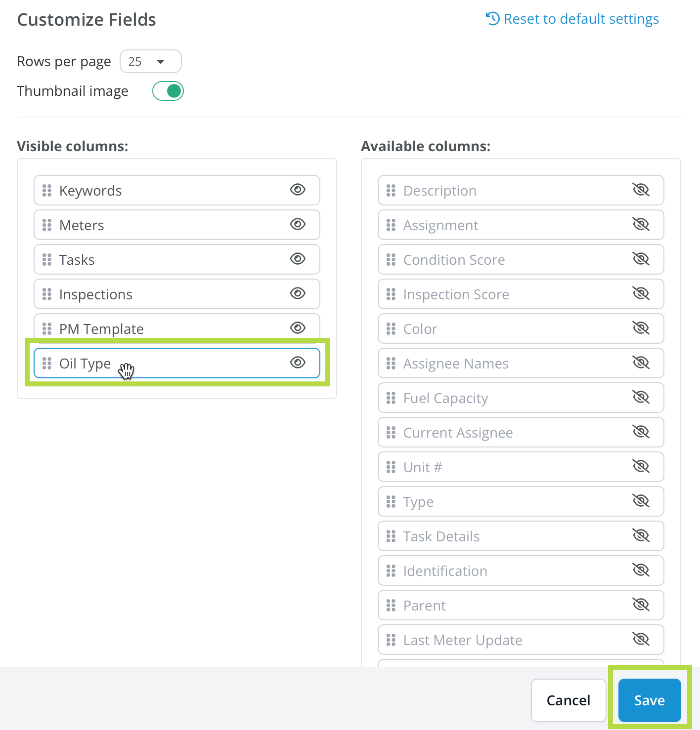 Select desired visible fields by dragging or clicking the eye icon, then click Save.
