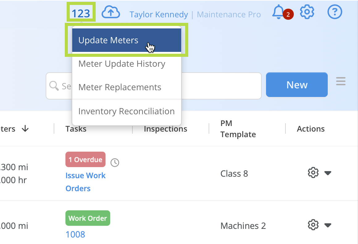 To update multiple meter readings simultaneously, click the 123 button in the top right corner and select Update Meters.