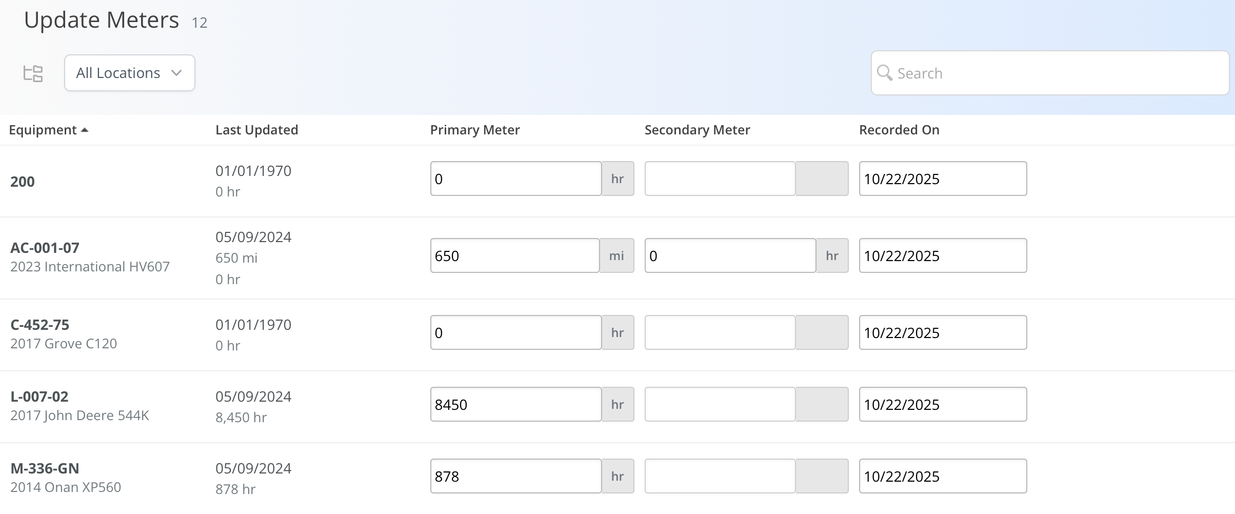 To update the meter reading for an individual unit, click the action gear icon to the right of the equipment list and select Update Meters.