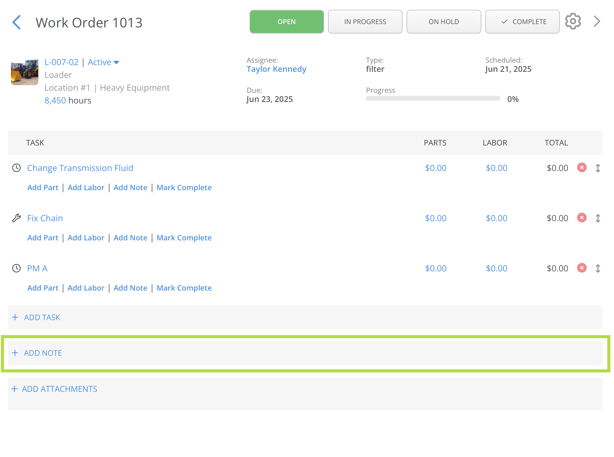 At the bottom of the Work Order Detail screen, options are available to add Notes and Attachments. Technician notes can be added to the Work Order for reference, and relevant pictures or documents can be uploaded to support the tasks being performed.