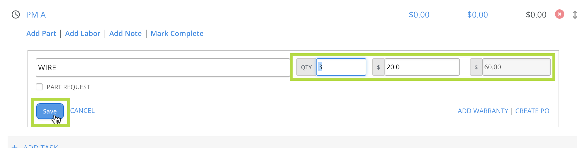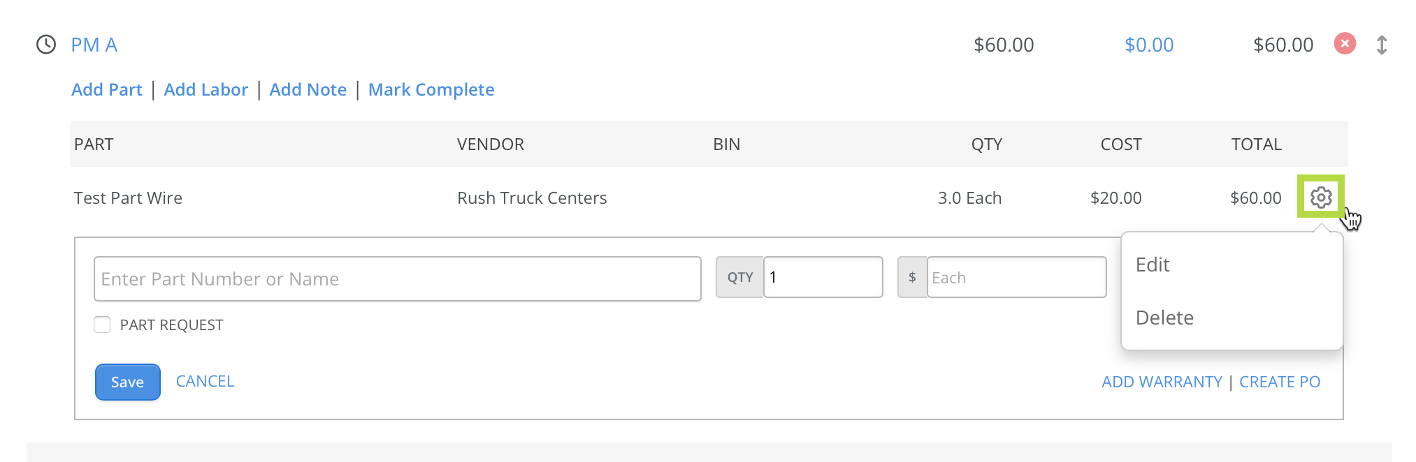 Select Save to add the part to the line item. The total cost automatically calculates based on quantity and unit cost. To edit or remove the part, use the action gear icon on the far right.