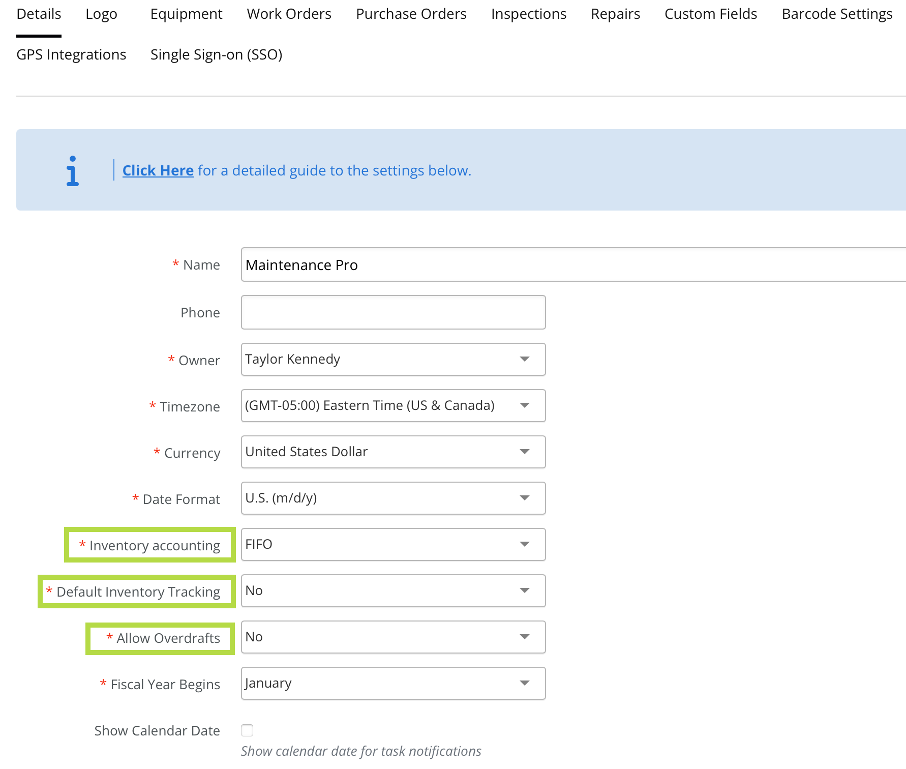 - If Default Tracking is set to Yes, Inventory Tracking is enabled automatically for all new parts.