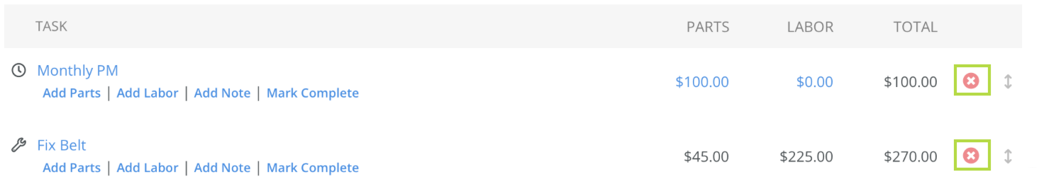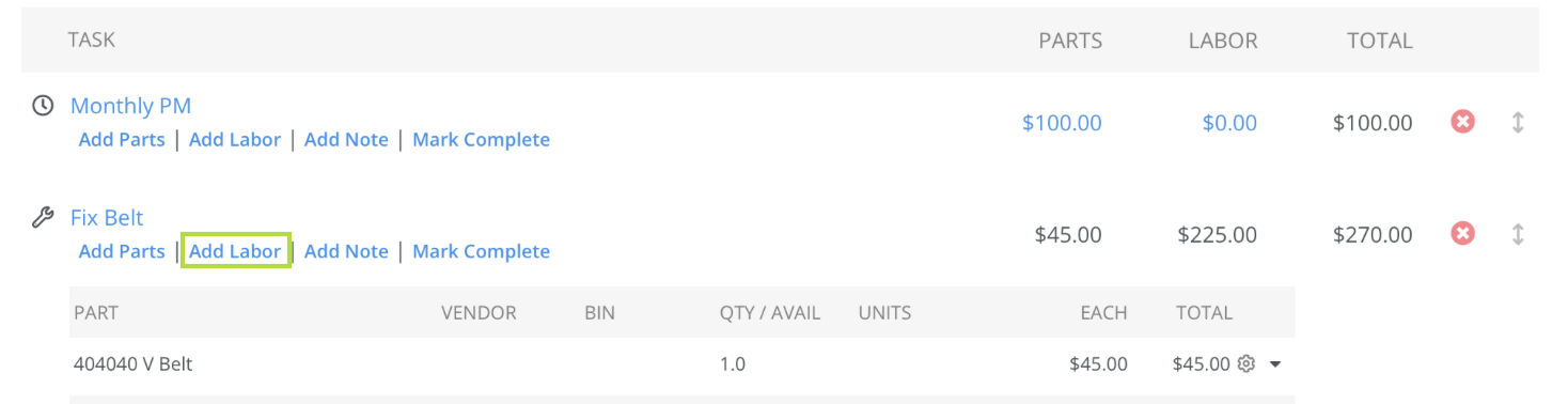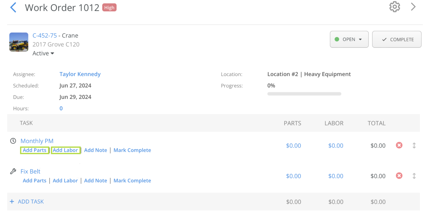 Parts and labor can be added to each Work Order task using the "Add Parts" and "Add Labor" options located underneath.