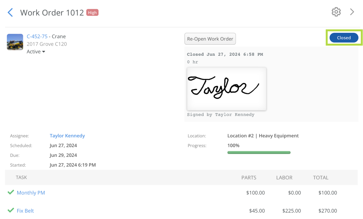 Any maintenance tasks on the completed Work Order will be viewable in the equipment's history.