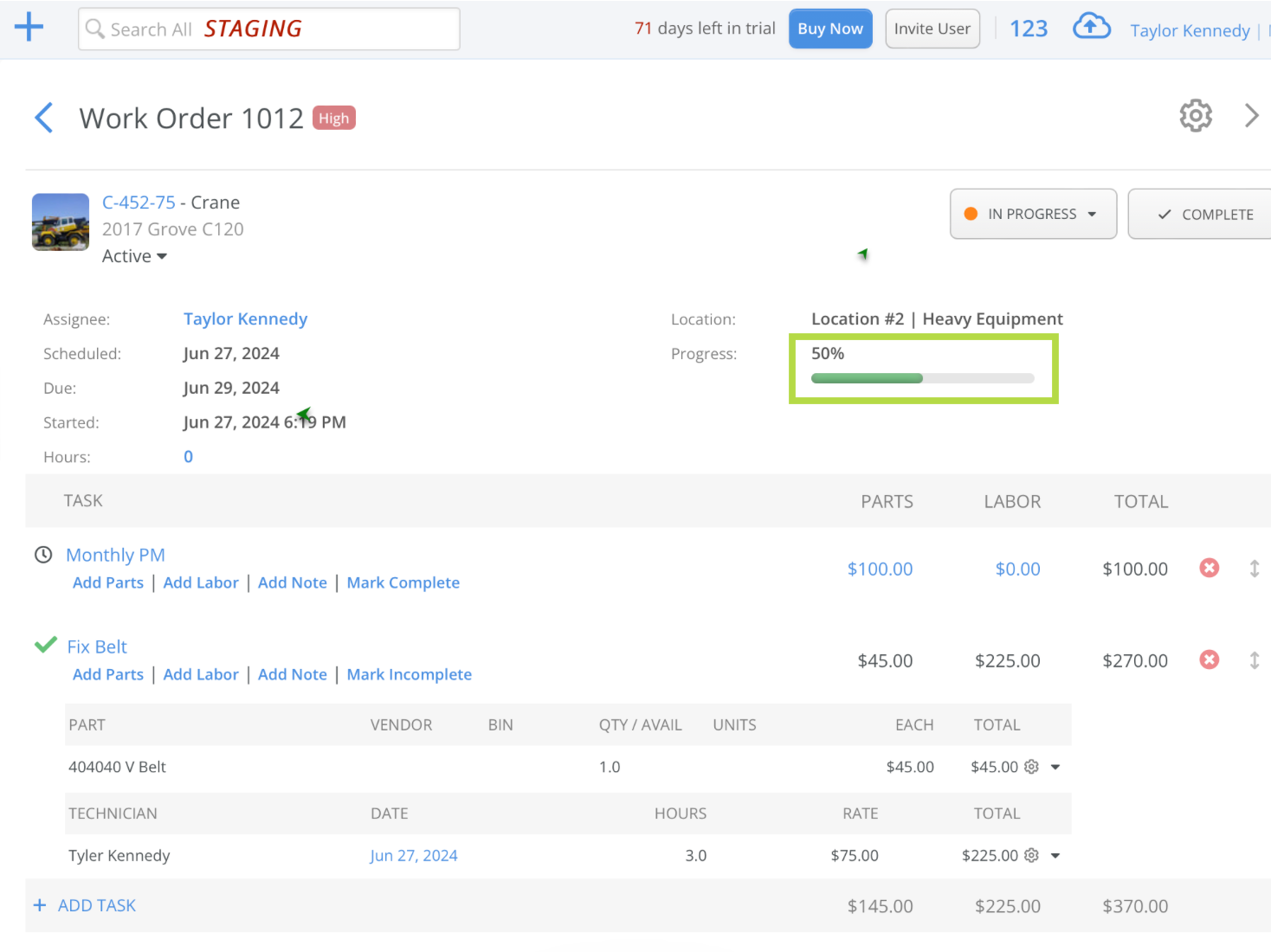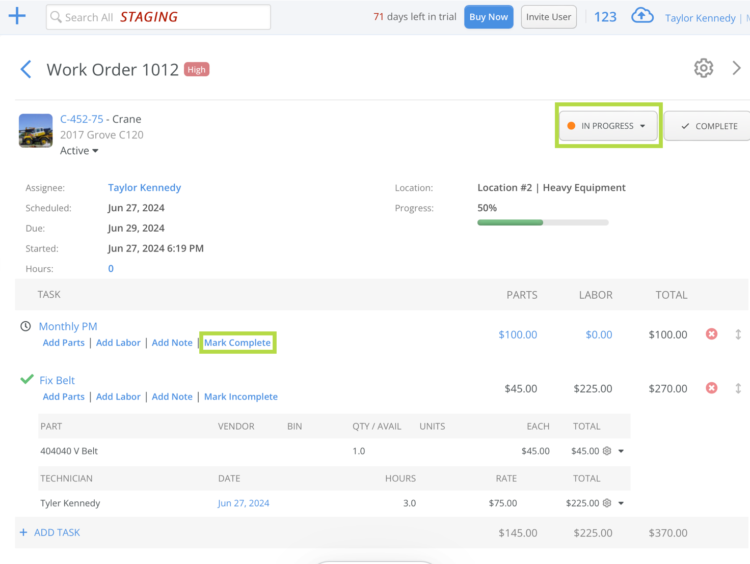 Once Mark Complete is clicked for any task, the Work Order status will automatically update to In Progress on the top right. A green check will appear to the left of the task name, showing that this particular task has been done. If a task was accidentally marked as completed, it can quickly be changed back to incomplete.