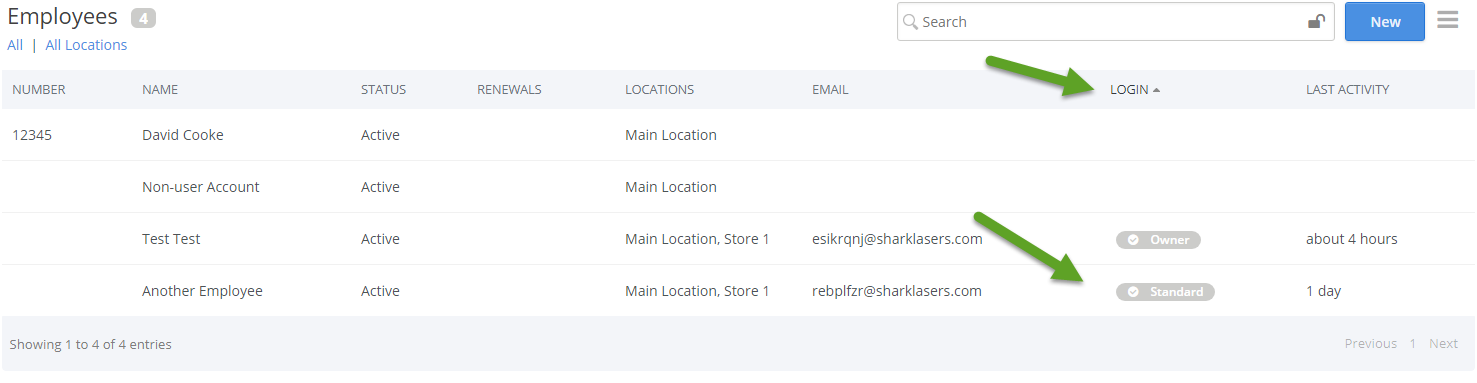 The Employees screen displays all employee records configured in the system. Employee records can be edited as needed. To add a new employee, click the New button in the top-right corner.