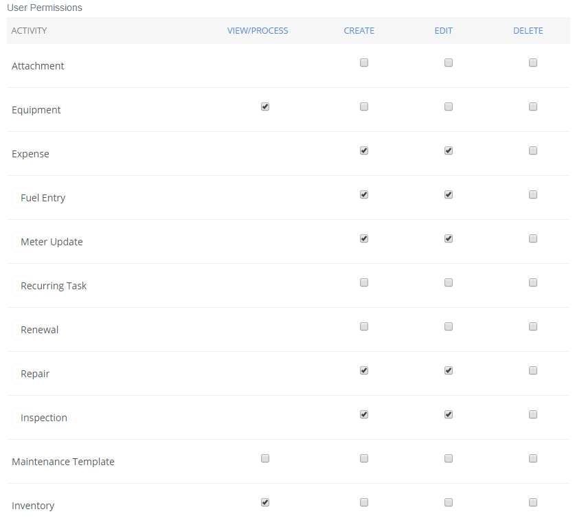 - Operator – Designed for equipment drivers/operators with minimal access. Operator users can view the equipment list, update equipment odometers, complete inspection checklists, and record manual fuel transactions.